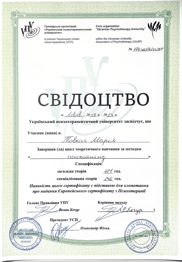 Окрім університетської освіти та спеціалізації у «психоаналізі», я проходжу власну психотерапію і регулярно відвідую супервізії.
